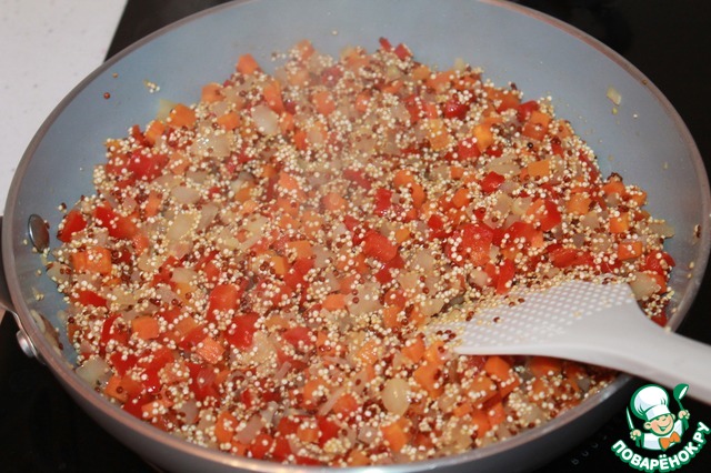 Затем в сковороду добавляем киноа и обжариваем все вместе в течение еще 3 минут. Огонь выше среднего.