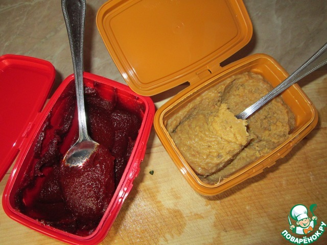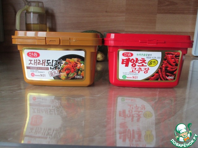 В коричневой коробочке соевая паста "Дендян", в красной острая перцовая паста "Кочудян". Кстати, если вы не любите Кочудян, то можете просто добавить красный жгучий перец по вкусу