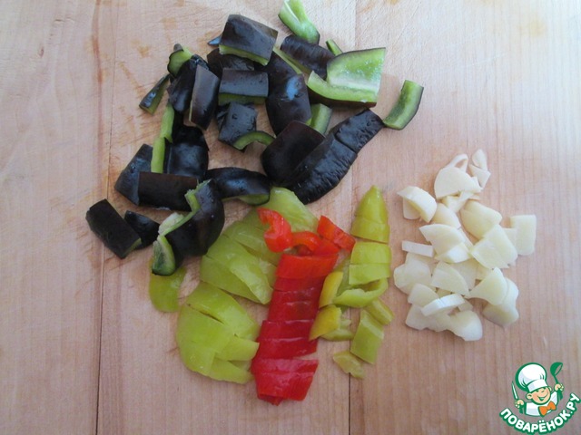 Нарезать болгарский перец, острый перец и чеснок
