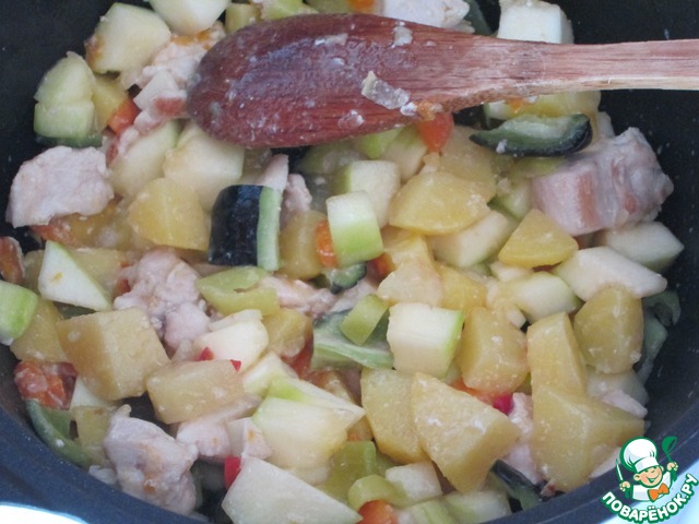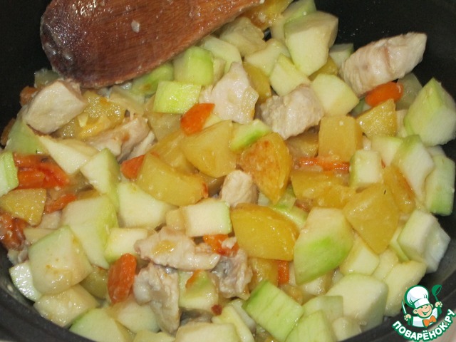 Картофель дошел до полуготовности. Вводим кабачок, перемешиваем
