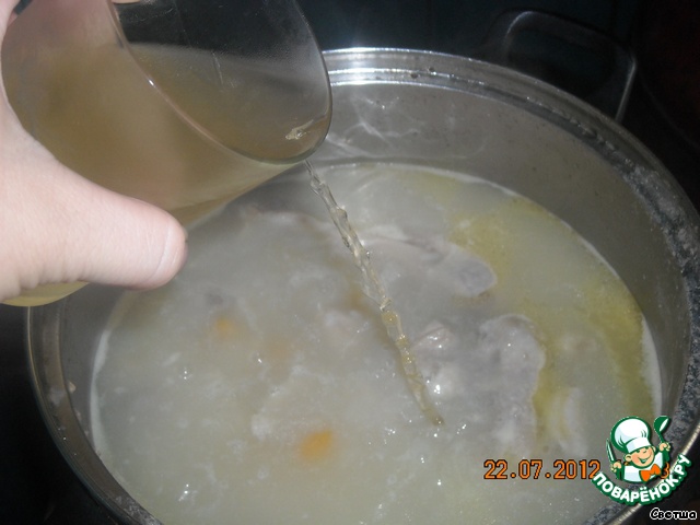 Нарежьте курицу кусочками, положите в кастрюлю и залейте 1,5 л холодной воды. Доведите до кипения и варите на слабом огне 1-1,5 часа. Не забудьте снимать пену.