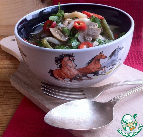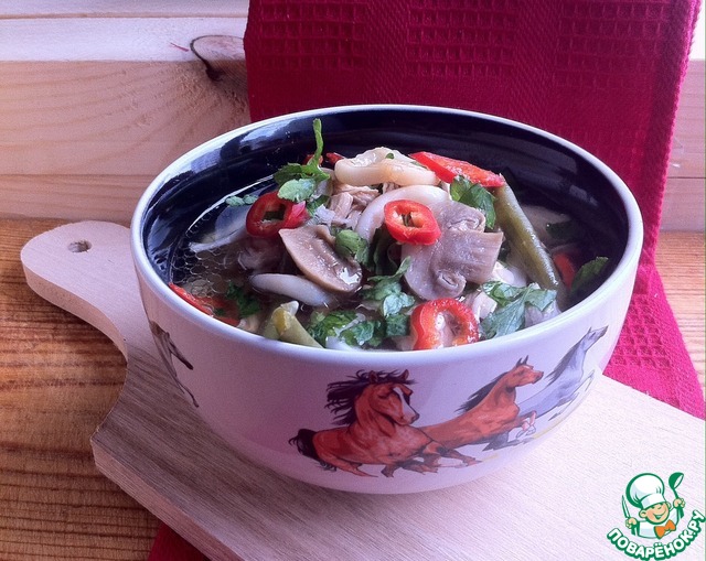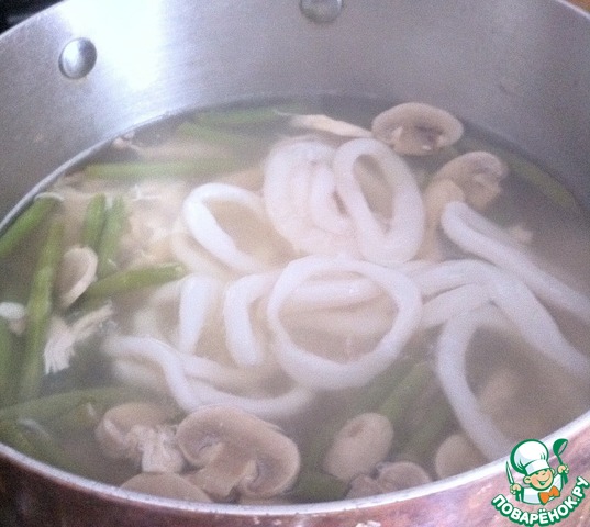 Похлёбка из курицы с кальмаром, грибами и стручковой фасолью