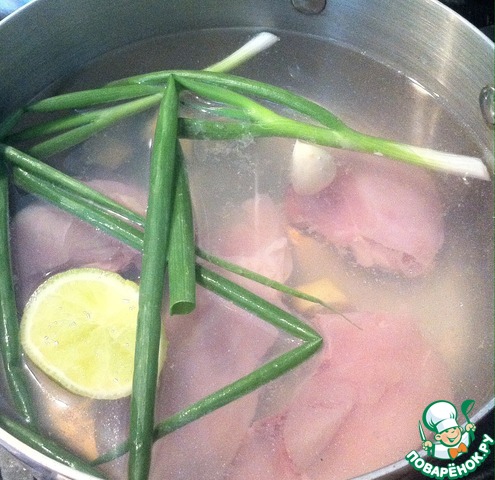 Куриную грудку разрубить на несколько частей. Сложить в кастрюлю вместе с зелёным луком, имбирём, чесноком и половинкой лайма. Залить водой и после закипания варить на медленном огне не меньше часа.