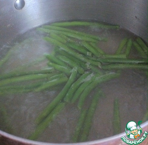 Процеженный бульон довести до кипения и забросить фасоль. Варить 5 минут.