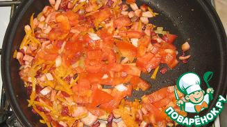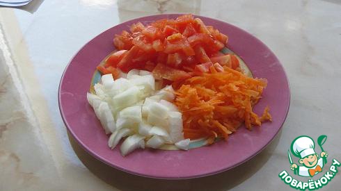 Лук мелко режем, морковь трем на терке, помидор режем кубиками.