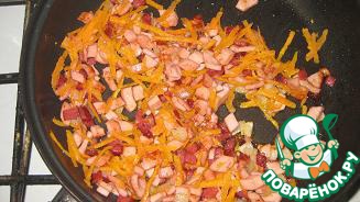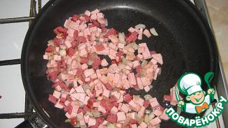 Готовим поджарку. На разогретой сковороде в растительном масле обжариваем лук, добавляем колбасу, жарим до золотистой корочки.