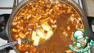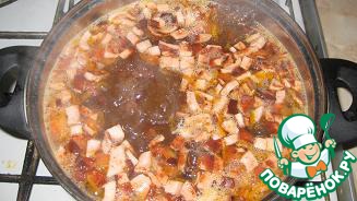 К этому времени у нас уже закипела вода, выкладываем в кастрюлю поджарку и даем повариться минут 5-7.