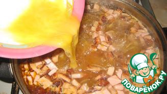За 10 минут до готовности выливаем яйцо, сразу перемешиваем, чтобы оно не сварилось одним большим куском.