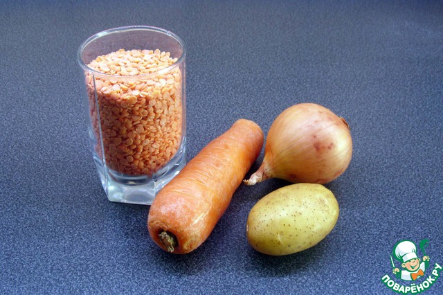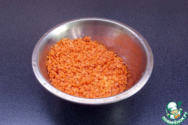 В кастрюлю налить холодную воду. Чечевицу промыть и положить в кастрюлю с водой (предварительно замачивать красную чечевицу не надо). Поставить на огонь. Не солить.