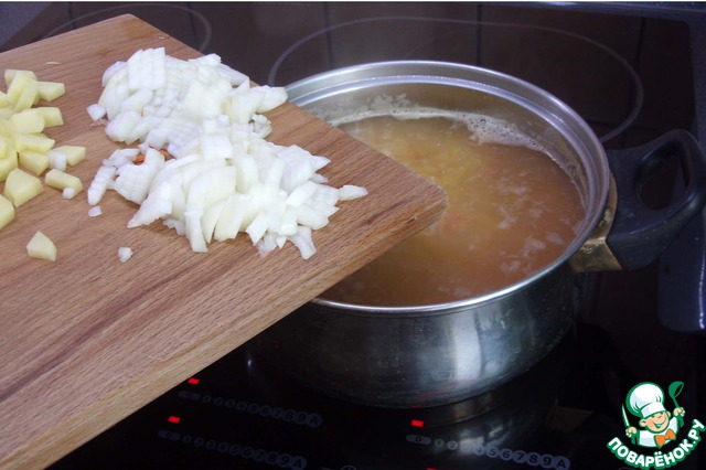 Положить в бульон лук и картофель. Добавить лавровый лист. Варить еще 12 мин. Добавить измельченный и слегка раздавленный чеснок, соль, специи. Дать настояться минут 20. Подавать с любимой зеленью.