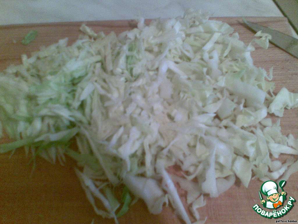Порезать капусту. Бросить в бульон. Когда капуста готова, добавить горошек или кукурузу и зелень. Да, зелени на самом деле должно быть много. Посолить, поперчить.