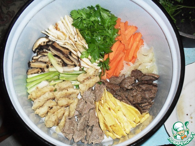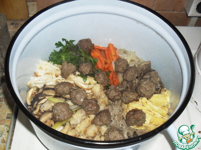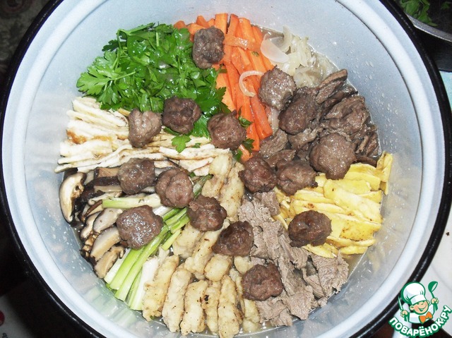 Взять большую кастрюлю, разложить в ней на дне секторами все получившиеся ингредиенты: зеленый лук, грибы, белковый блин, петрушку, морковь, жареный лук, жареное мясо, желтковый блин, вареное мясо, рыбу в кляре.