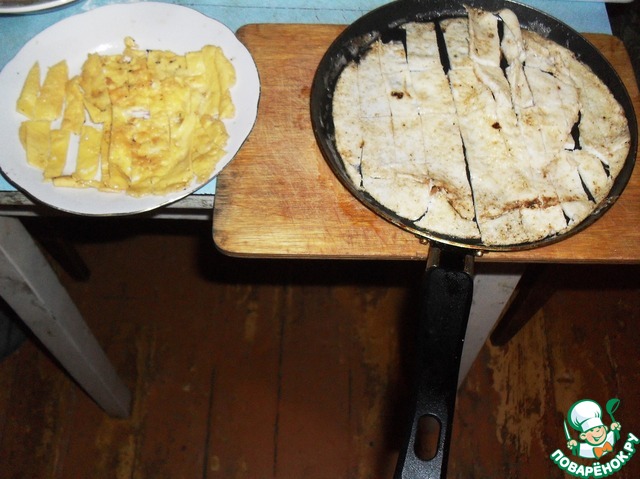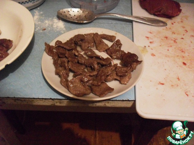 Другую часть мяса нарезать тонкими ломтиками около 4 см в длину. Обжарить не очень сильно.