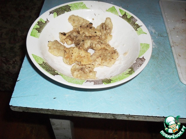 Нарезать треску маленькими кусочками. Разбить одно яйцо, перемешать желток с белком, обмакивать каждый кусочек рыбы туда, потом в 2 ст. л. муки. Обжарить получившуюся рыбу в кляре.