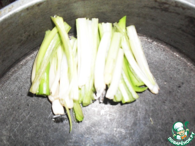Нарезать светлую часть лука кусочками по 4 см длиной и разрезать их пополам.