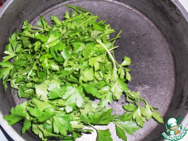 Обрезать черешки у петрушки, разрезать оставшиеся части по 4 см.