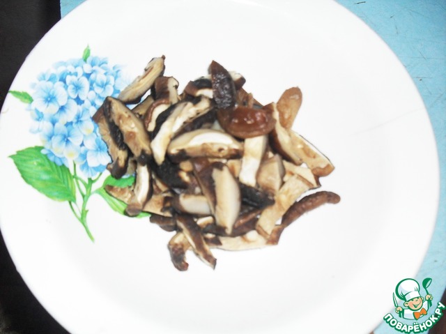 Грибы шиитаке замочить (если сушеные), разрезать полосками по 4 см.