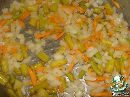 Добавить к фасоли, всё перемешать и ещё немного обжарить.