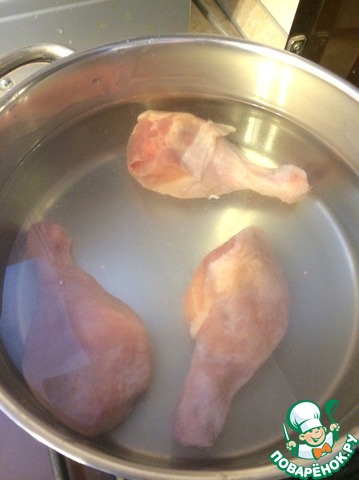 Суп варю в шестилитровой кастрюльке. Наливаем 4л воды, кладем куриные голени, доводим до кипения, снимаем пену и оставляем вариться на маленьком огне.