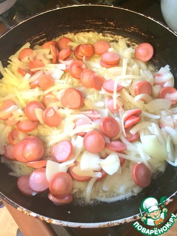 Затем немного обжариваем на растительном масле сосиски и лук, выкладываем в суп.