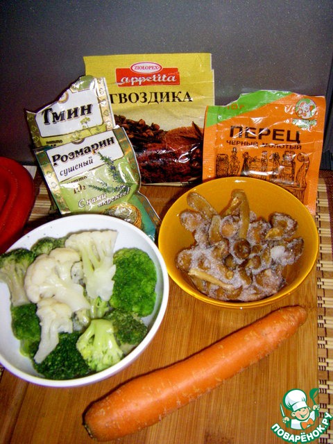 Когда бульон очистится убавляем огонь и варим еще 30 минут. В это время нарезаем морковь треугольничками и промываем опята (у меня замороженные).