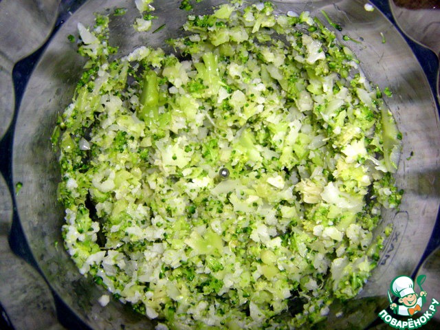 Измельчаем цветную капусту и брокколи. Я делаю это в блендере, но не сильно, чтобы не получилось пюре.