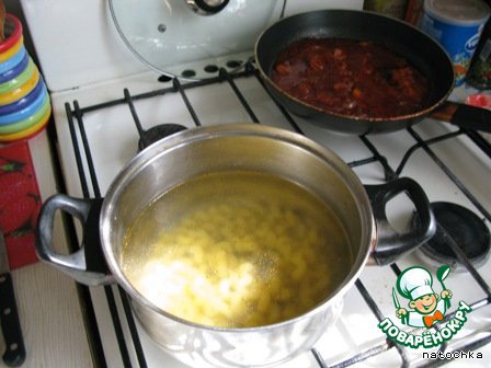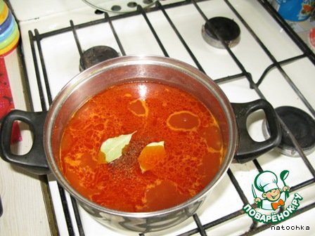 Добавляем в бульон мясо, томатную заправку, лавровый лист, черный перец, солим.