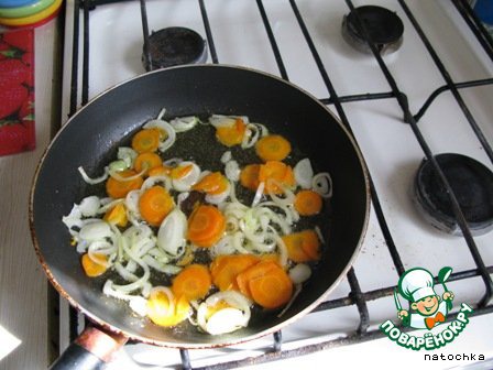 В сковородке на сильном огне хорошо разогреваем 1-2 ложки масла, добавляем туда же сначала лук, а через 1-2 минуты - морковь. Поджариваем до золотистого цвета!