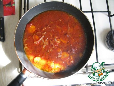 Добавляем в пассеровку томатную пасту, 1/2 ст. бульона, тушим все на медленном огне 5-7 минут.