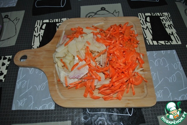 Картофель и морковь почистить, нарезать тонкими брусочками.