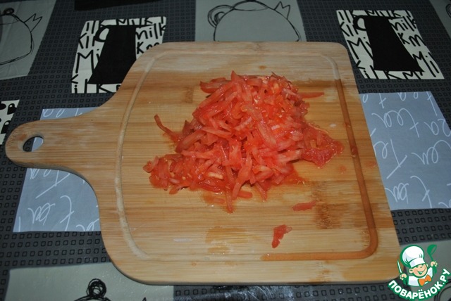 Помидоры ошпарить кипятком, очистить от кожицы, нарезать тонкими брусочками.