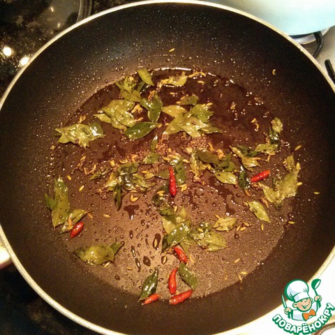 В сковороде разогреть растительное масло, добавить семена горчицы, оставшийся фенхель, перец чили стручковый, молотый (у меня был дробленый), оставшуюся куркуму, листья карри. Обжаривать под крышкой на среднем огне 4-5 мин.