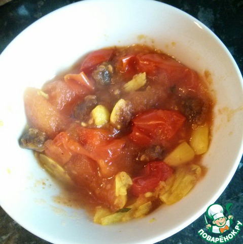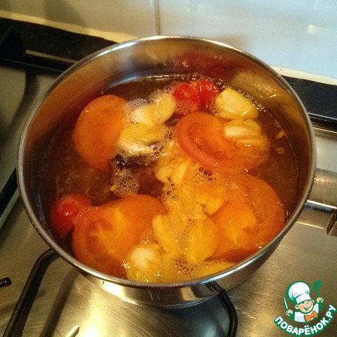 Помидоры порезать пополам, добавить половину куркумы (1/4 ч. л.), раздавленный чеснок, тамаринд, залить 300 мл. воды и довести до кипения, кипятить 5 минут.