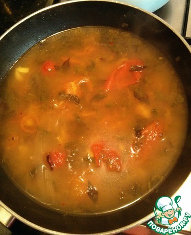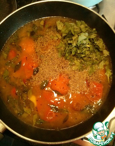В сковороду добавить овощи, бульон, молотую смесь, листья кинзы и 500 мл. воды. Довести до кипения и варить 5-7 минут.