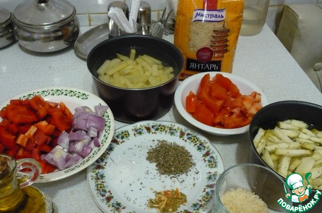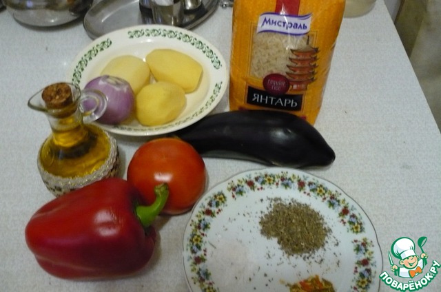 Баклажан почистили от шкурки, нарезали средней соломкой и замочили в холодной очень соленой воде, чтобы ушла горечь. Рис промыли и поставили вариться согласно инструкции. Картофель нарезали средней соломкой, перец средними и помидор крупными кубиками. Лук нарезать.