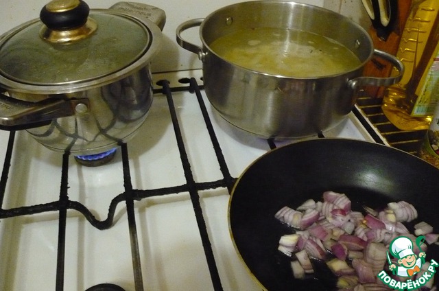 Когда вода в кастрюле под суп закипит, кладем промытый от крахмала нарезанный картофель, солим по вкусу. На сковороду налить немного масла и обжарить до полуготовности лук, положить к картофелю.