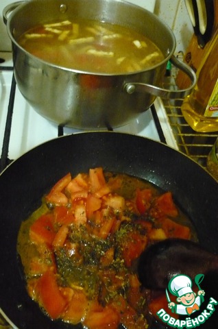 В последнюю очередь обжариваем помидор с базиликом и специями.