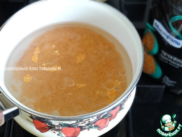 Чечевицу промыть, залить бульоном и варить 15 минут;