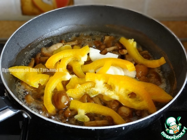 Затем заложить грибы и чили;