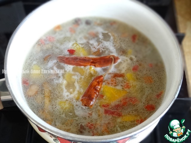 Похлебку с чили прокипятить 1-2 минуты, убрать с плиты и вынуть перец (чем дольше чили будет находится в супе, тем острее он будет, так что остроту нужно регулировать по вкусу и желанию);
