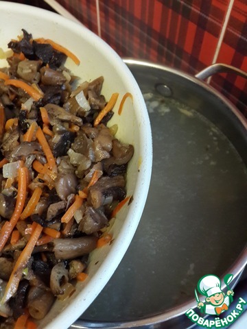 Затем выкладываем зажарку из моркови, лука и грибов. Варим еще 5 минут. Пробуйте на соль. Грибы соленые - зачастую дополнительной соли не требуется