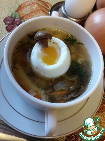 Разливаем по тарелкам, посыпаем зеленью. В каждую тарелку кладем яичко всмятку.