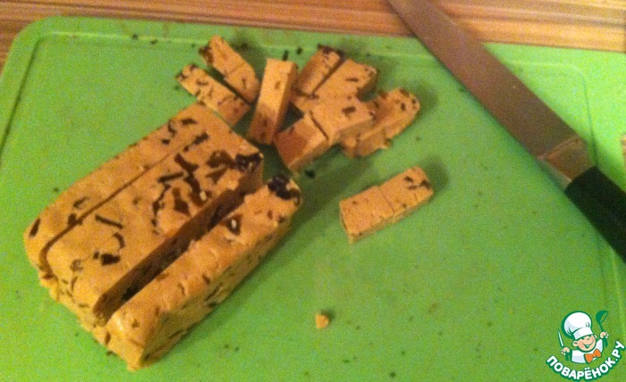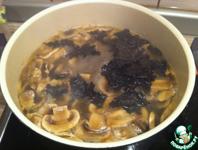 Пока варятся лук, грибы и нори, режем тофу кубиками (у меня он был с добавлением морской капусты) и так же отправляем к остальным ингредиентам в кастрюлю. Ждем еще 5 минут.