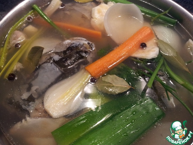 Часть овощей используем для бульона. Головы и овощи моем, закладываем в кастрюлю, доводим до кипения. Ставим тише огонь, снимаем пену, добавляем соль и приправы, оставляем на час. Затем процеживаем.