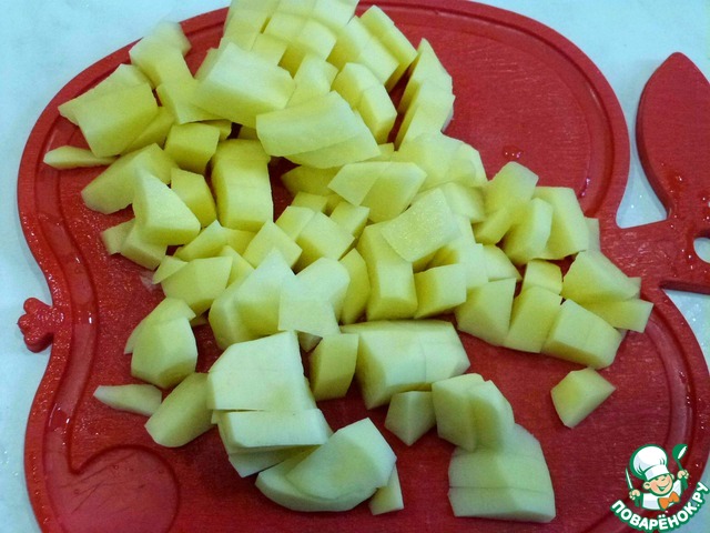 На огонь ставим кастрюлю с водой, я брала кастрюлю на 3л, наполнила водой на половину. Картофель режем кубиками и бросаем в кипящую воду.