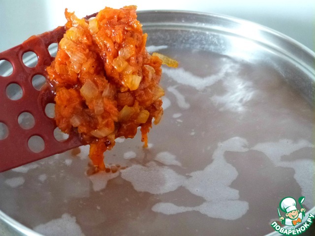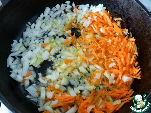 Лук режем кубиками, морковь трем на крупной терке. Обжариваем на растительном масле