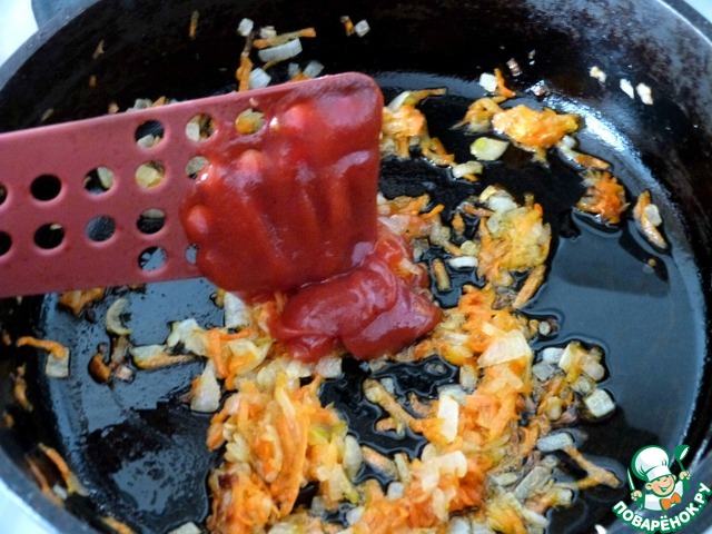 В зажарку добавляем томатную пасту (я брала краснодарский соус), или помидоры.