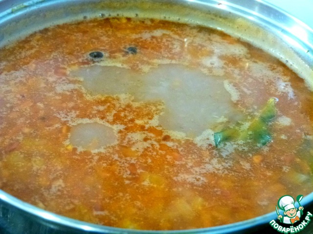 В кипящий суп выкладываем чеснок, солим и добавляем специи по вкусу, я использовала– черный молотый перец, пару перчинок душистого перца горошком, немного кориандра, лавровый лист, молотая красная паприка. Дать прокипеть еще 3-5 минут и выключаем.