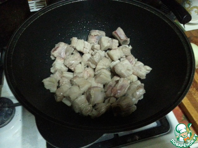 Мясо режется небольшими кусочками и обжаривается на раскаленном масле при постоянном помешивании до образования золотистой корочки...