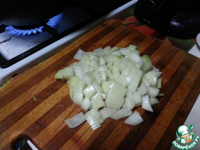 Лук режется небольшим кубиком и добавляется в мясо. Жарится до золотистого цвета